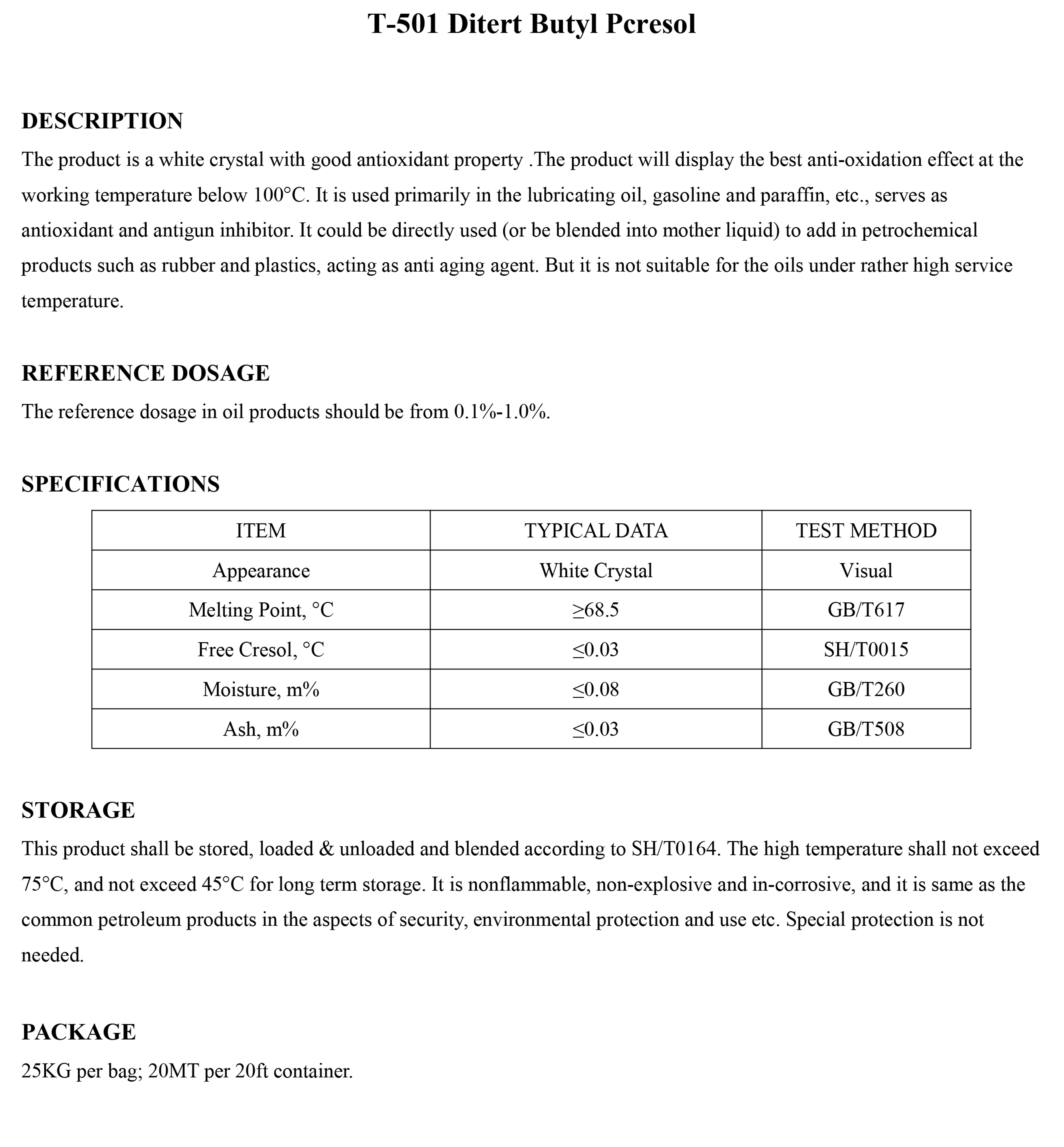 T-501 Ditert Butyl Pcresol-Antioxidant and Antiglue Additive-錦州新興石油添加劑有限責(zé)任公司